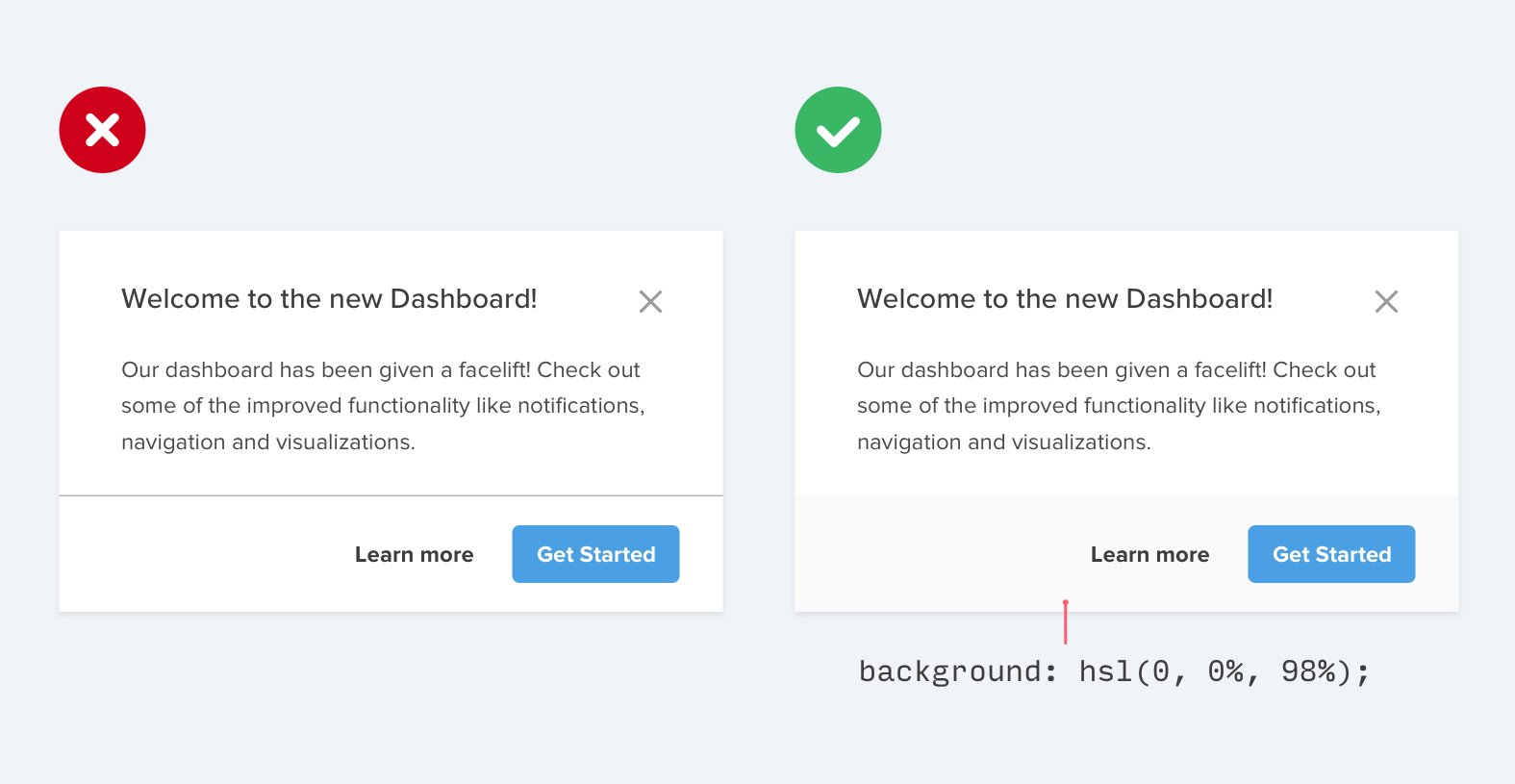 通常,相鄰的元素背景只需要有微妙的差別就能夠讓人對他們進行區(qū)分。所以,你所需要做的就是在不同的區(qū)塊采用不同的背景色,并且嘗試刪除邊框,因為你根本不需要它。