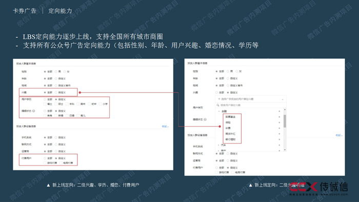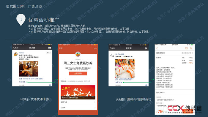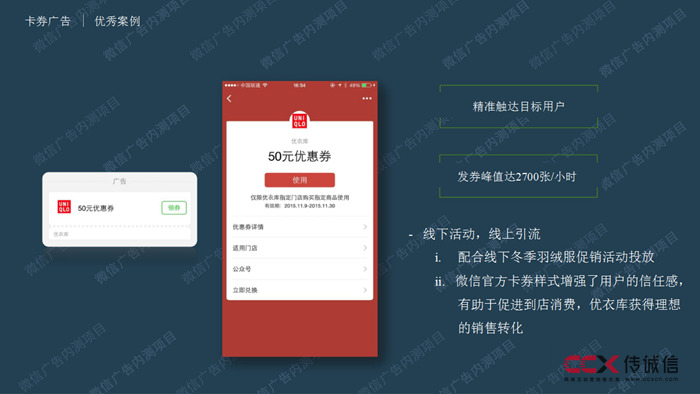 通過微信廣告的精準定向,卡券可以實現(xiàn)有效覆蓋和精準觸達,推送給商戶的潛在高價值客戶,為大到商圈、小到便利店的眾多商家創(chuàng)造卓有成效的用戶拉動。