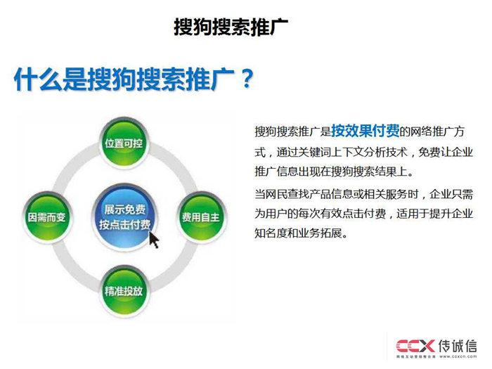 搜狗搜索推廣是按效果付費的網絡推廣方式,通過關鍵詞上下文分析技術,免費讓企業推廣信息出現在搜狗搜索結果上。