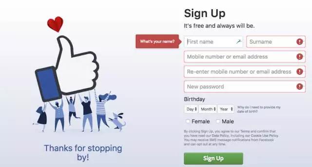 你不能僅依靠色彩來傳達信息。比如某些類型的色盲用戶可能很難,甚至不能看到常見的紅色錯誤通知。解決方案之一就是在需要用戶注意時同時使用色彩和符號。Facebook的表單填寫和相應的錯誤通知就是一個很好的例子。