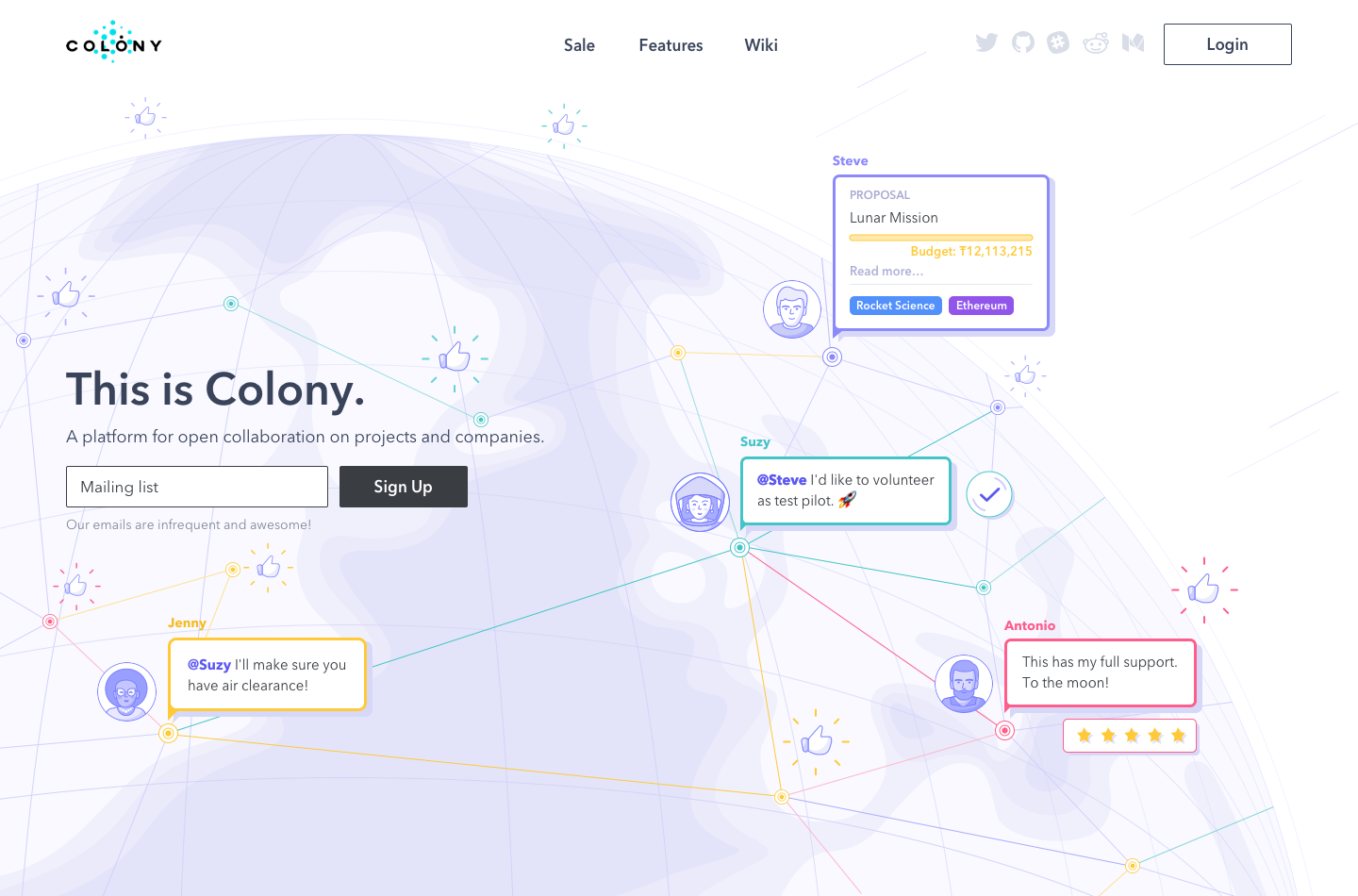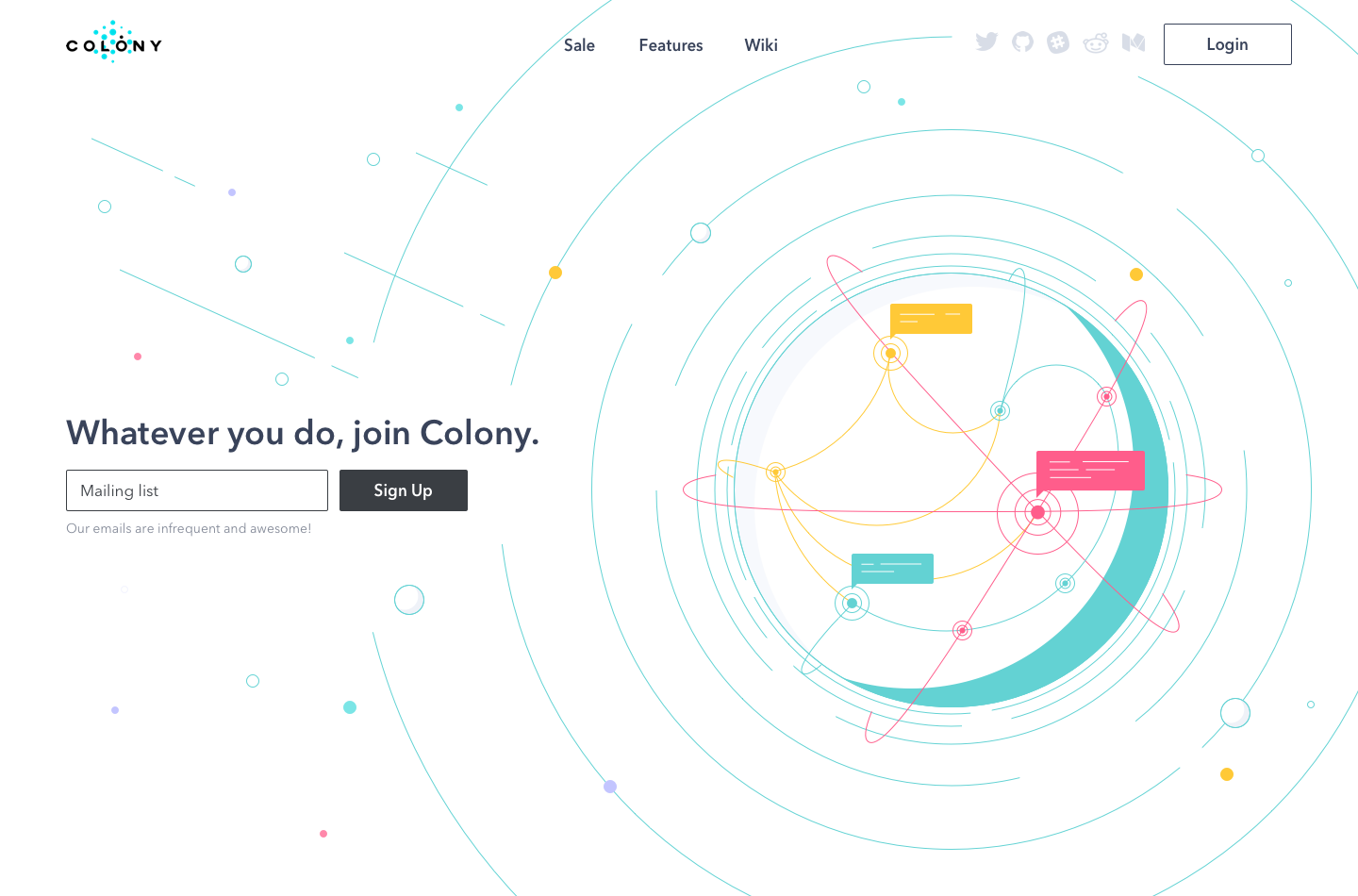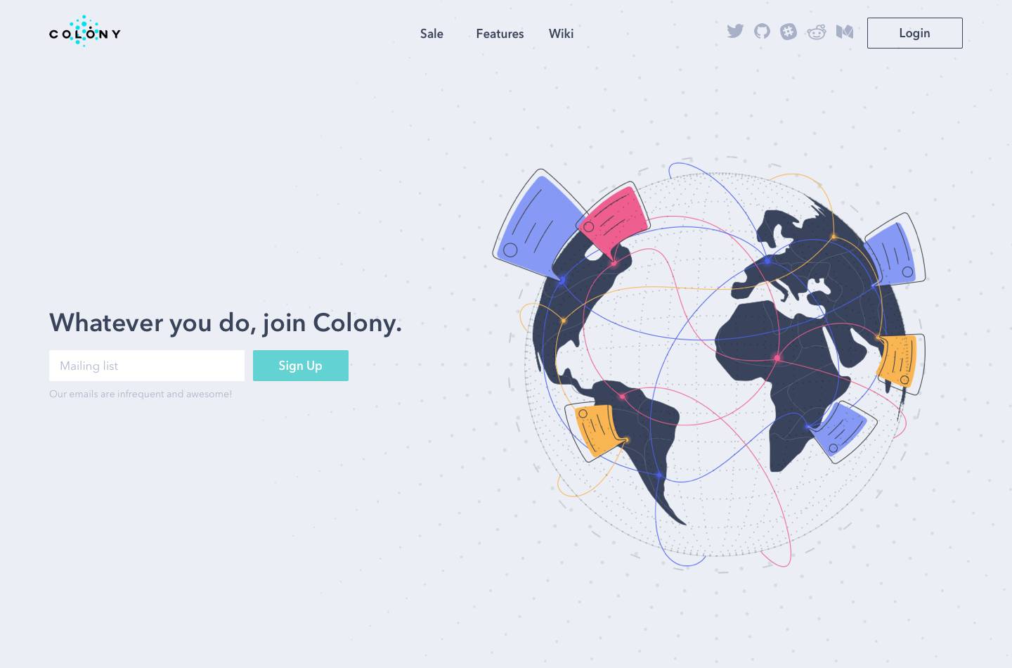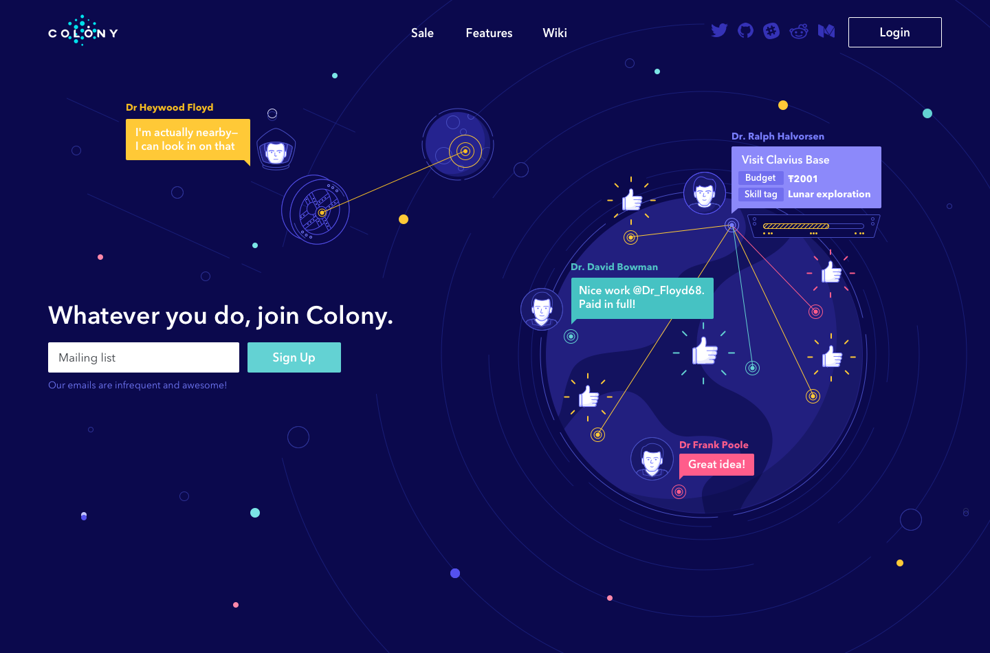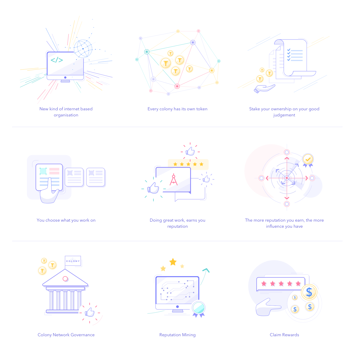 設(shè)計(jì)師們拿出了不同風(fēng)格的插畫,它們在主題上和整個(gè)UI保持一致,營造出友好、平易近人的氛圍,同時(shí)也讓人對整個(gè)公司形象產(chǎn)生足夠的好感。插畫中展示出 Colony 是如何幫助世界各地的用戶溝通、交流、達(dá)成目標(biāo)的。