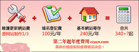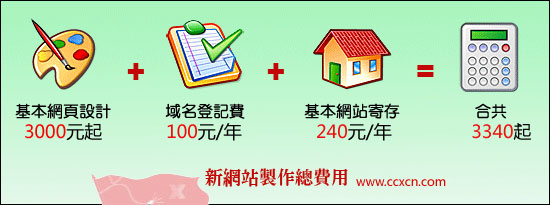 ???? 一個網站的成本包括域名登記年費和網站寄存費用,全包意味著客戶需要完全使用同一公司的服務。為了給客戶最大的彈性,傳誠信網站建設(ccxcn.com)讓客戶自選網存服務。各公司的網存服務有不同特色,空間費用的差別可達10倍,客戶亦有可能想把網站放在外國的伺服器,這些在傳誠信都可達成。
