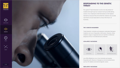 斯克工業是一種病毒的網站,新的X戰警電影。布局是簡單而有效的。它被劃分為三部分,導航側欄固定到左右,在中心的視頻,和主要內容的右側垂直滾動。這里使用視頻創建電影的期待。在導航圖標的動畫懸停效果是一個很好的接觸。,表現突出視頻網站的點是明確的。轉換是相當漂亮的,滑出內容部分和備份。另外,嘗試調整您的瀏覽器看如何布局的變化-導航是隱藏的,你向下滾動頁面的內容可見。
