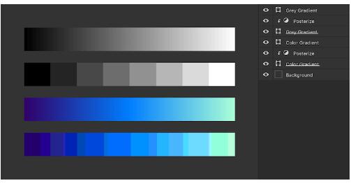對一個漸變進行折疊,將其分為固定數量的步驟(后綴限制使用的顏色數量)。Photoshop和親和設計師都包括通過海報調整層進行后綴的能力??梢詫⒁粋€海報調整層放置在漸變上方,將其分割成平面顏色的步驟。