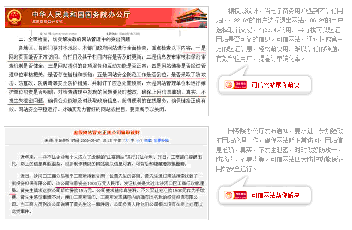 ? ??a) “可信網(wǎng)站”驗證,是由我國域名注冊管理機構(gòu)中國互聯(lián)網(wǎng)絡信息中心(CNNIC)提供技術(shù)支持,由北龍中網(wǎng)(北京)科技有限責任公司負責實施的第三方網(wǎng)站身份信息權(quán)威驗證服務。是我國誠信互聯(lián)網(wǎng)體系建設的重要組成部分。它通過對域名注冊信息、網(wǎng)站信息和企業(yè)工商或事業(yè)單位組織機構(gòu)信息進行嚴格交互審核來驗證網(wǎng)站真實信息,并利用先進的木馬掃描技術(shù)幫助網(wǎng)站了解自身安全情況,是中國數(shù)百萬網(wǎng)站的“可信身份證”,也是億萬網(wǎng)民判別網(wǎng)站是否可信的權(quán)威驗證標識