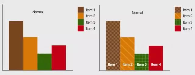 與其使用多種顏色,不如嘗試對需要強調的元素使用不同的紋理。例如:色盲用戶可能難以解釋左側的圖表。這時,最好使用有對比的紋理。可以的話,盡量加上文字說明。