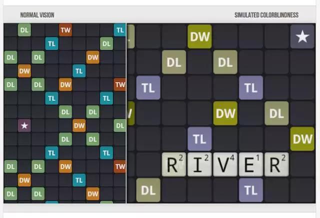 不要僅僅用黑色和白色作為唯一對比色,你應該嘗試在設計中使用一系列清晰的顏色對比和色調對比。例如,Word Feud游戲中的色塊使用的四種顏色,不管用戶是否有色覺缺失,都能輕易識別。